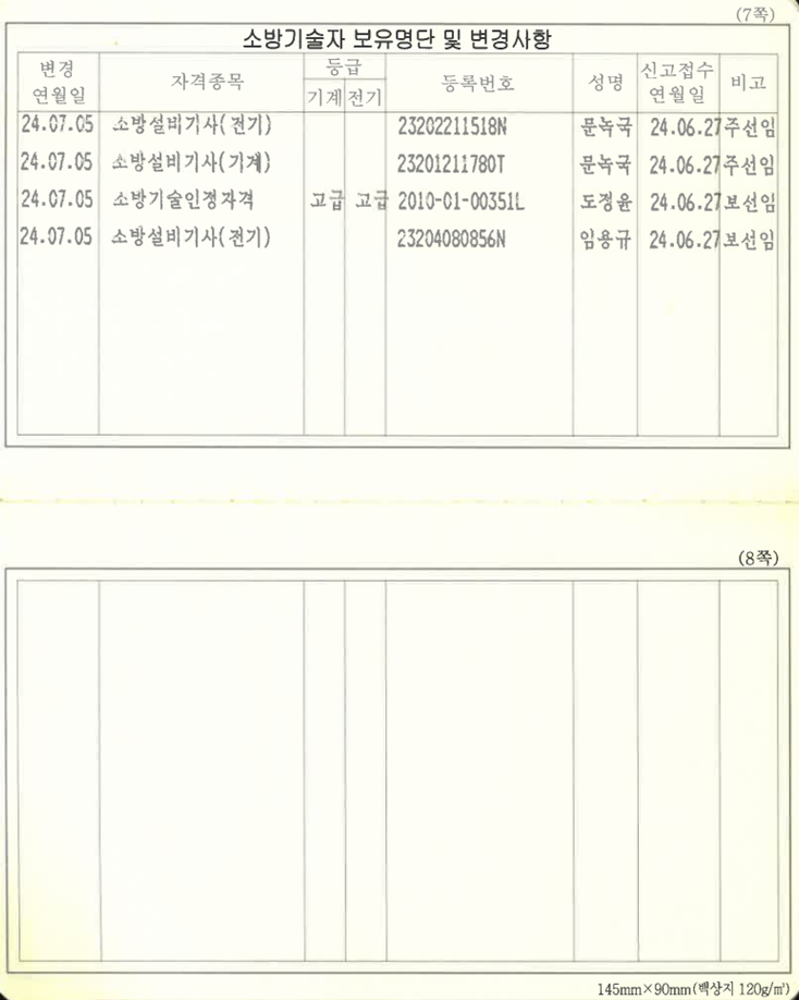 | 소방기술자 | 도정윤 | 품질 | 차장 | 소방설비기사(기계) | 기계, 전기 특급 | 2024-06-01 |